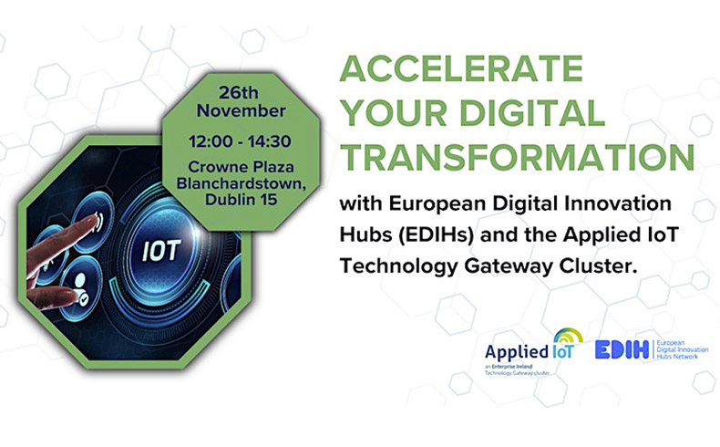 On 26th November, the Applied IoT Cluster together with Ireland’s two European Digital Innovation Hubs (ENTIRE EDIH Ireland and Data2Sustain) will host a free lunchtime event, Accelerate your Digital Transformation with EDIHs and the Applied IoT Technology Gateway Cluster, at the Crowne Plaza Blanchardstown.